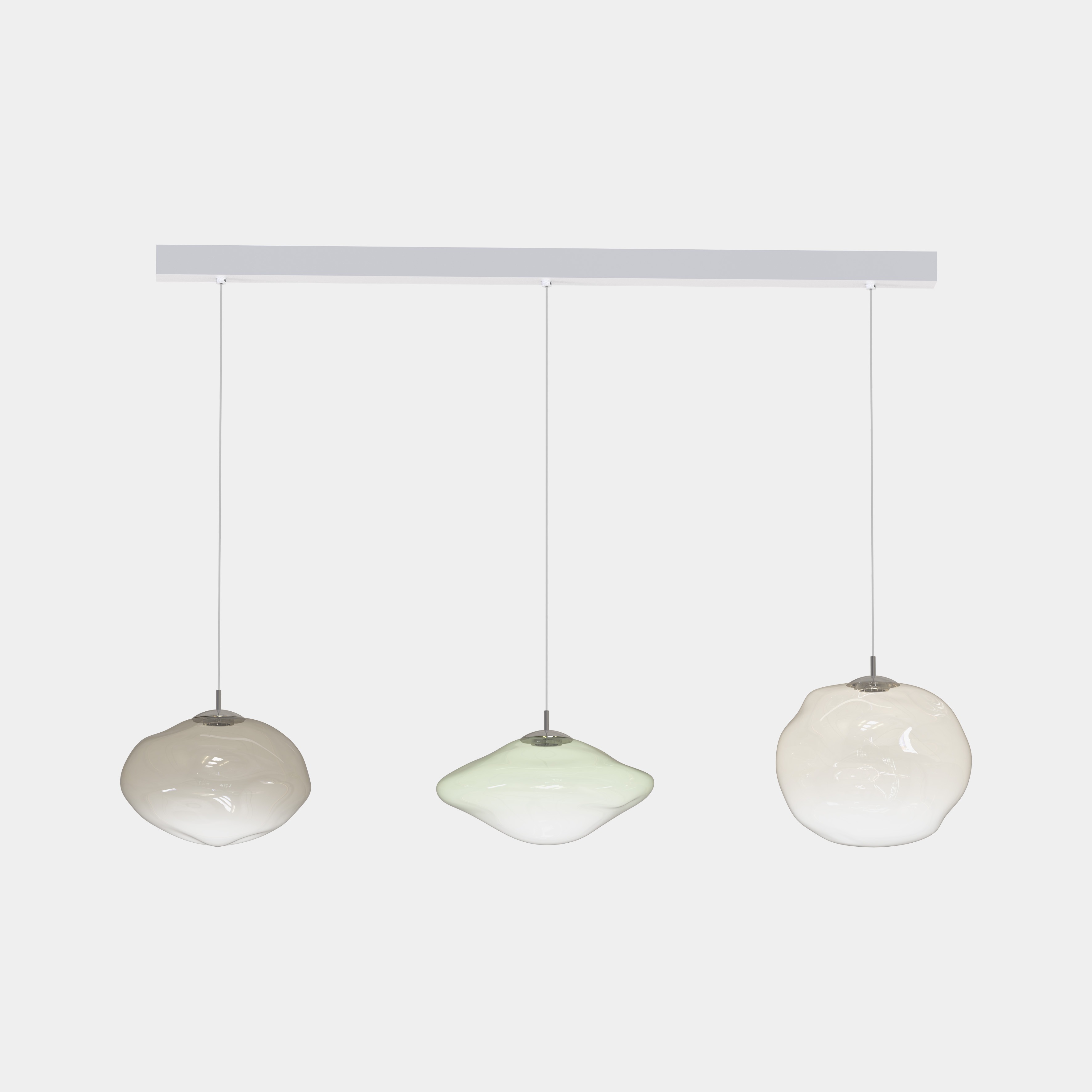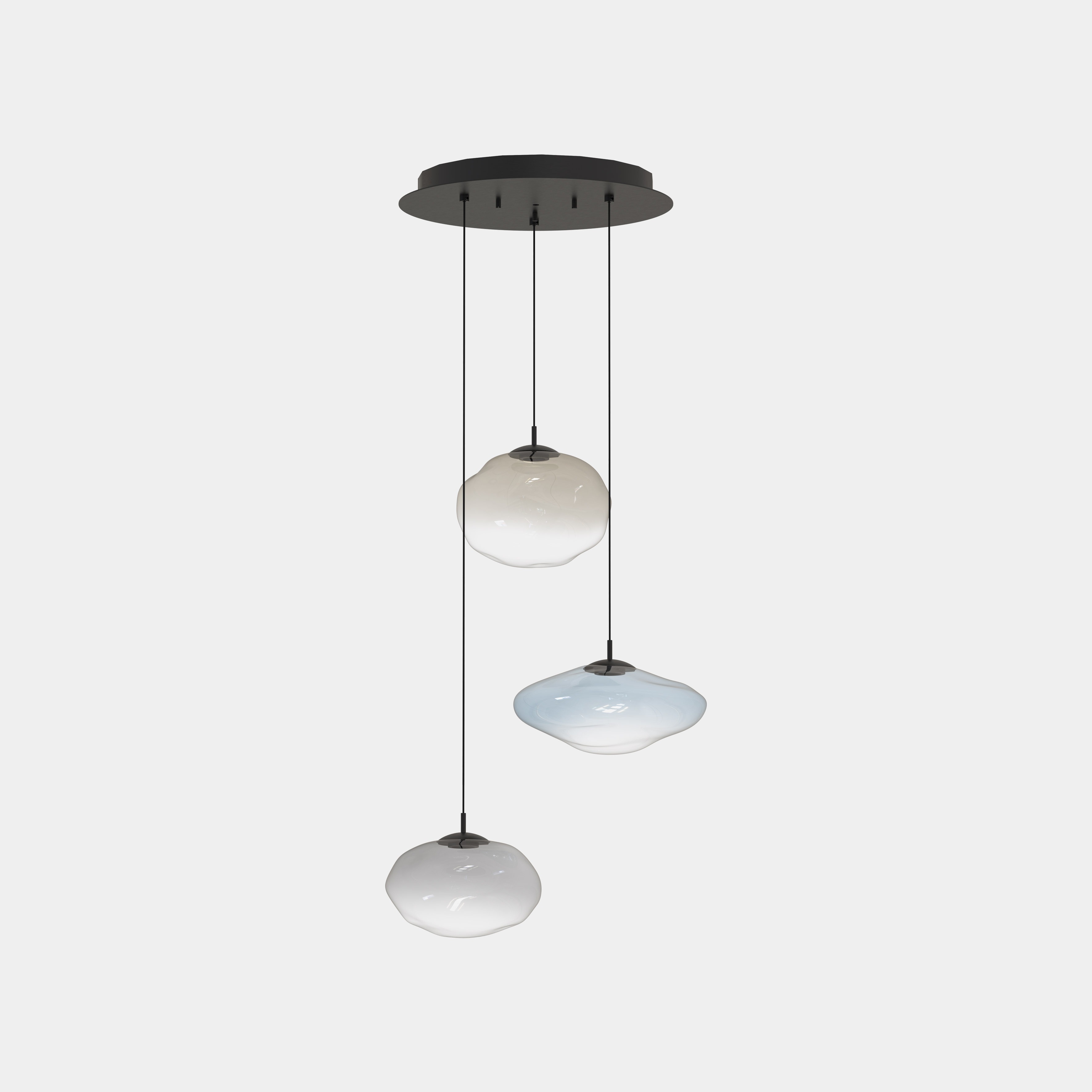 Inspirerad av planeter, organiska former, flygande tefat och månens ytor förmedlar varje Mark-lampa en unik vision av rymden. De tre formerna – bollen, ovalen och skivan – tillverkade i blåst glas, berättar en historia om förvandling, från den ursprungliga volymen till dess naturliga utveckling.